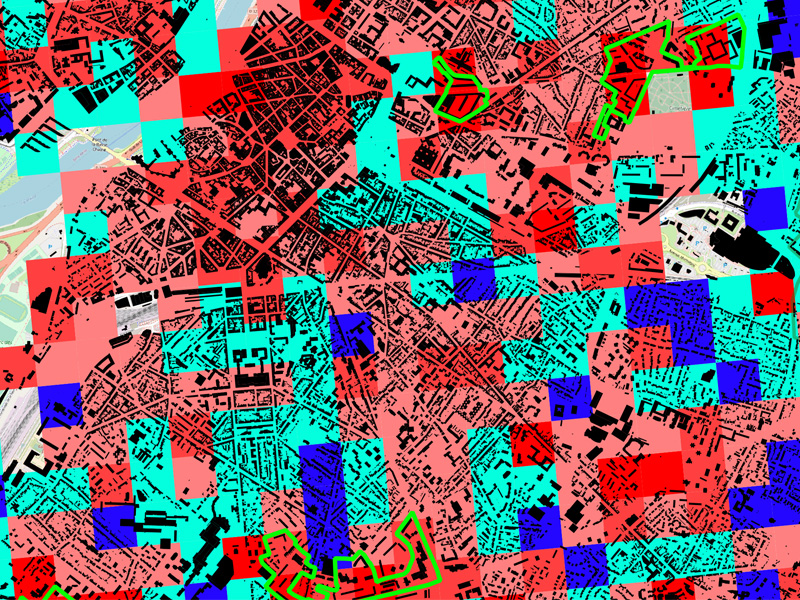 À partir des fichiers locaux sociaux et fiscaux (FILOSOFI) de l’INSEE, il est possible de calculer des seuils de pauvreté à l’échelle fine de carrés de 200 x 200 mètres. Ils permettent de cartographier la pauvreté économique et donc de déceler des dynamiques de concentration, relégation voire ségrégation dans des quartiers de la ville, voire des communes à une échelle plus large.