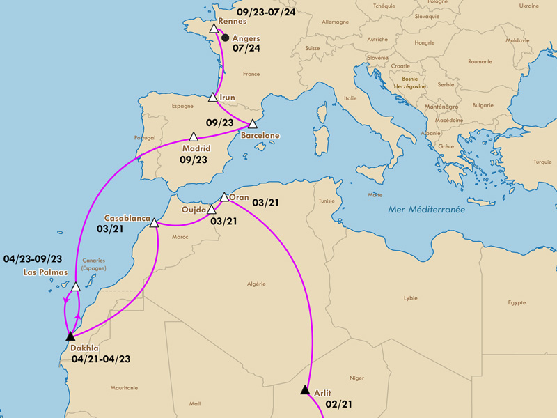 3« Passer le désert » est une autre épreuve, redoutée par les migrant.e.s en raison des risques. Des pillards sillonnent les pistes et rançonnent les migrant.e.s quand ils le peuvent. Le passage de Sébastien se fait en voiture pendant deux jours, presque sans arrêts. Une fois arrivé en Algérie, à Oran, Sébastien se rend compte grâce aux informations recueillies auprès des autres migrant.e.s que le passage par le Maroc est moins cher et plus « facile ». Avec un petit groupe et l’aide d’un passeur rencontré à la gare routière d’Oran, ils parviennent, de nuit et en passant par des sentiers, à gagner le Maroc où ils sont déposés à Oujda – nous sommes en mars 2021.